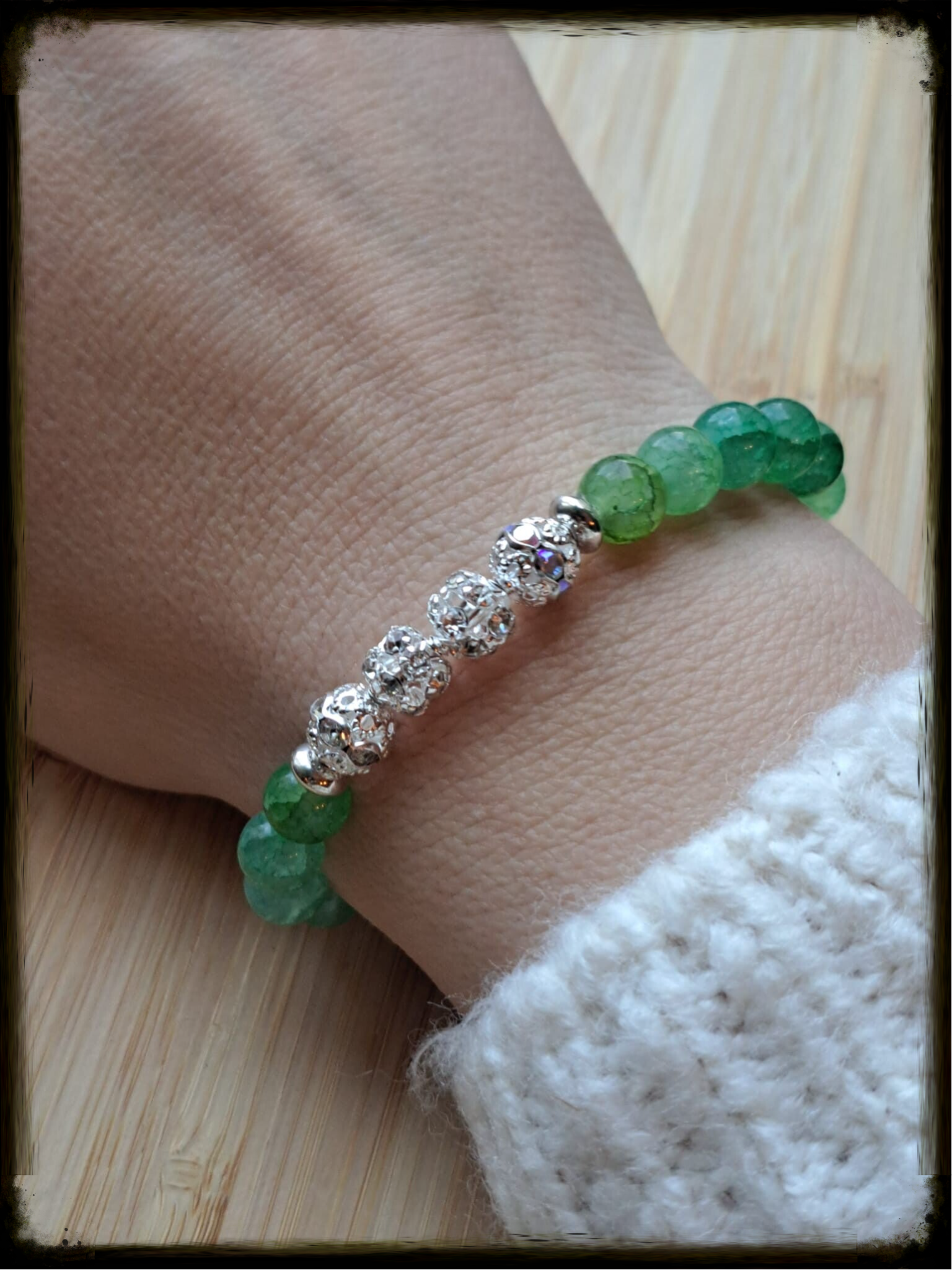 Rustig, maar toch opvallend – dat is deze feestelijke armband! Groene glaskralen, lichtdoorschijnend met verfijnde details, worden gecombineerd met zilveren kralen vol fonkelende strass steentjes. Een stijlvolle match met de warme, sprankelende sfeer van kerstmis!