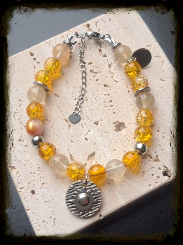Deze armband straalt zonlicht. De warme gele glaskralen met hun speelse witte details geven een levendig, bijna schilderachtig effect. Ze worden gecombineerd met zacht doorschijnende, lichtgele kralen die het licht prachtig doorlaten, alsof er altijd een beetje zon om je pols hangt.
