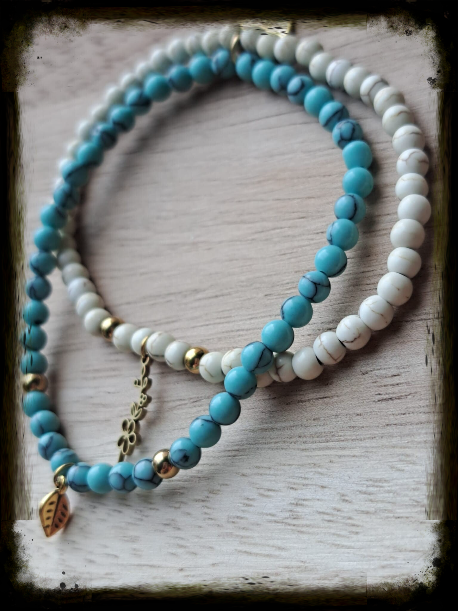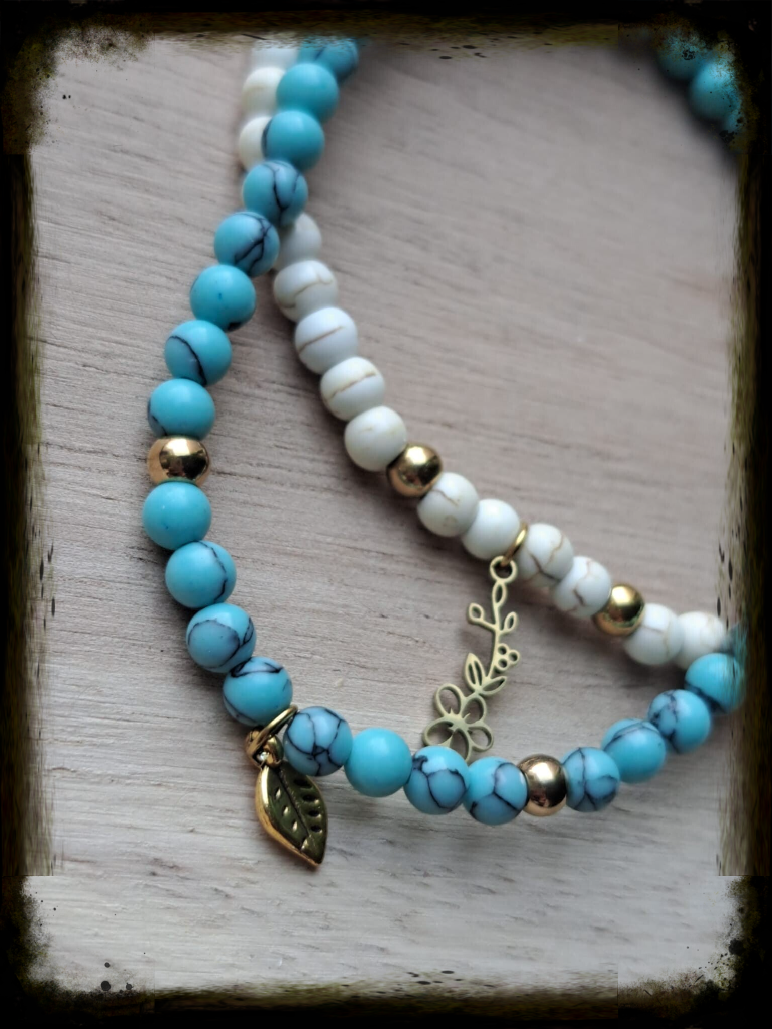 De eerste armband heeft turkoois-blauwachtige glaskralen met donkere blauw-zwarte lijnen die als natuurlijke aders door de kralen lopen. Deze worden gecombineerd met twee gouden kralen en een goudkleurige bedel in de vorm van een blad.