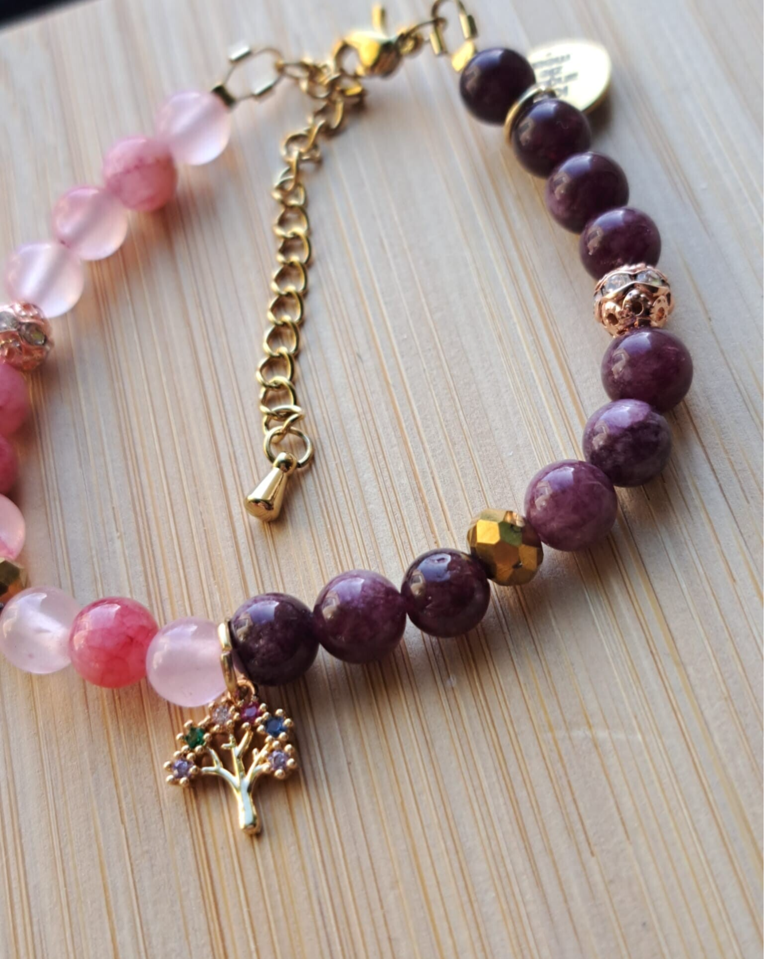Tussen de kralen zitten twee facetkralen met een goudachtige glans die het licht vangen en een warme schittering geven. Daarnaast zorgen twee rosegouden, opengewerkte kralen met strasssteentjes voor een verfijnde fonkeling. Samen brengen ze verbinding tussen beide kanten.
