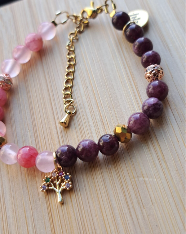 Aan de armband hangt een bedel van een boom, waarvan de takken zijn afgewerkt met kleine, gekleurde strasssteentjes die doen denken aan bloesem. Deze boom staat voor groei, ontwikkeling en alles wat zich in de tijd ontvouwt. De bloesem symboliseert de momenten waarop iets wat vanbinnen groeit, zichtbaar wordt aan de buitenkant.