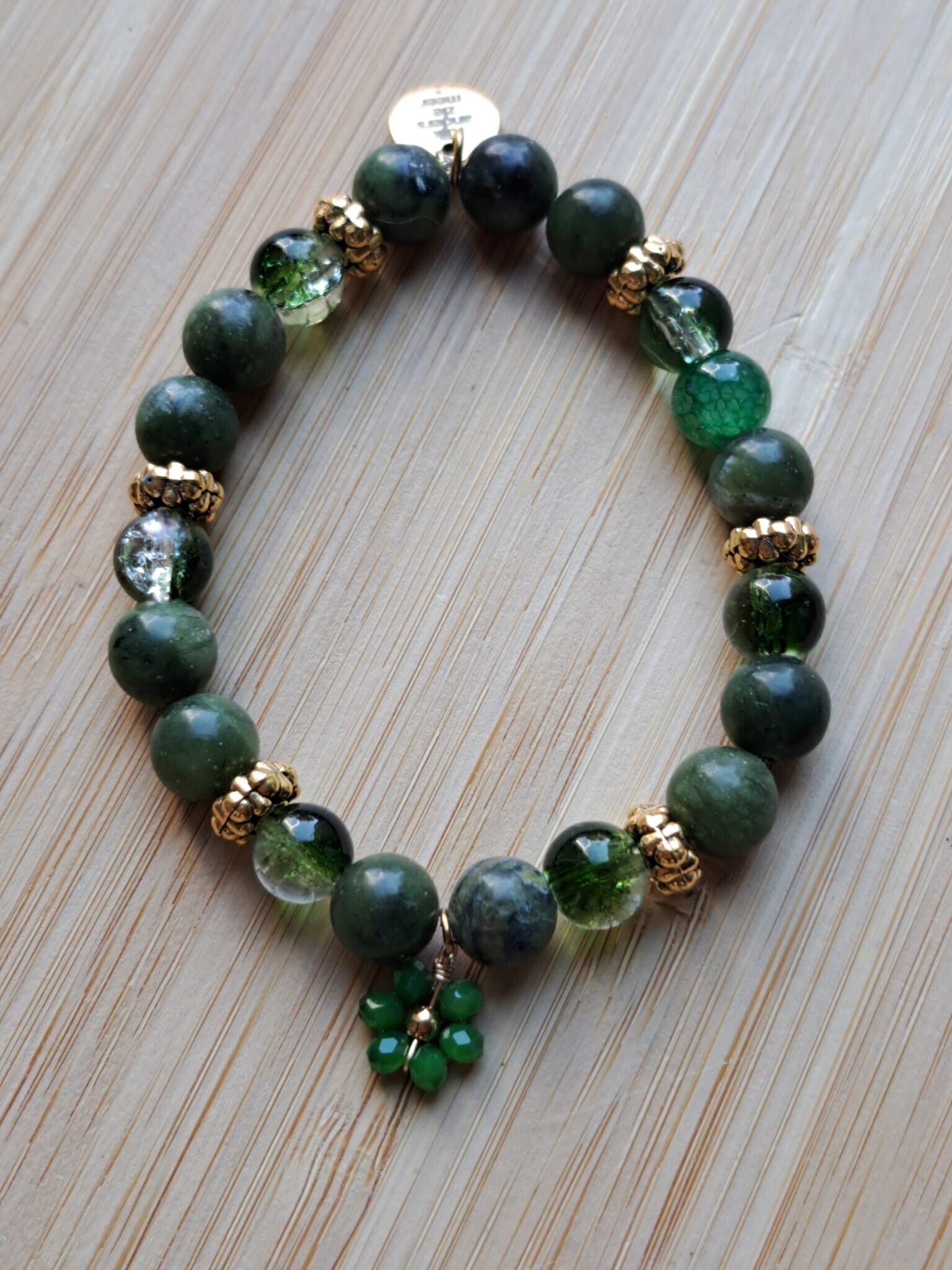 Deze elegante armband straalt rust, groei en kracht uit. De combinatie van donkergroene natuursteenlook kralen en transparante glaskralen met diepe smaragdgroene accenten zorgt voor een luxe en frisse uitstraling. De gouden spacers geven de armband warmte en een chique finishing touch.